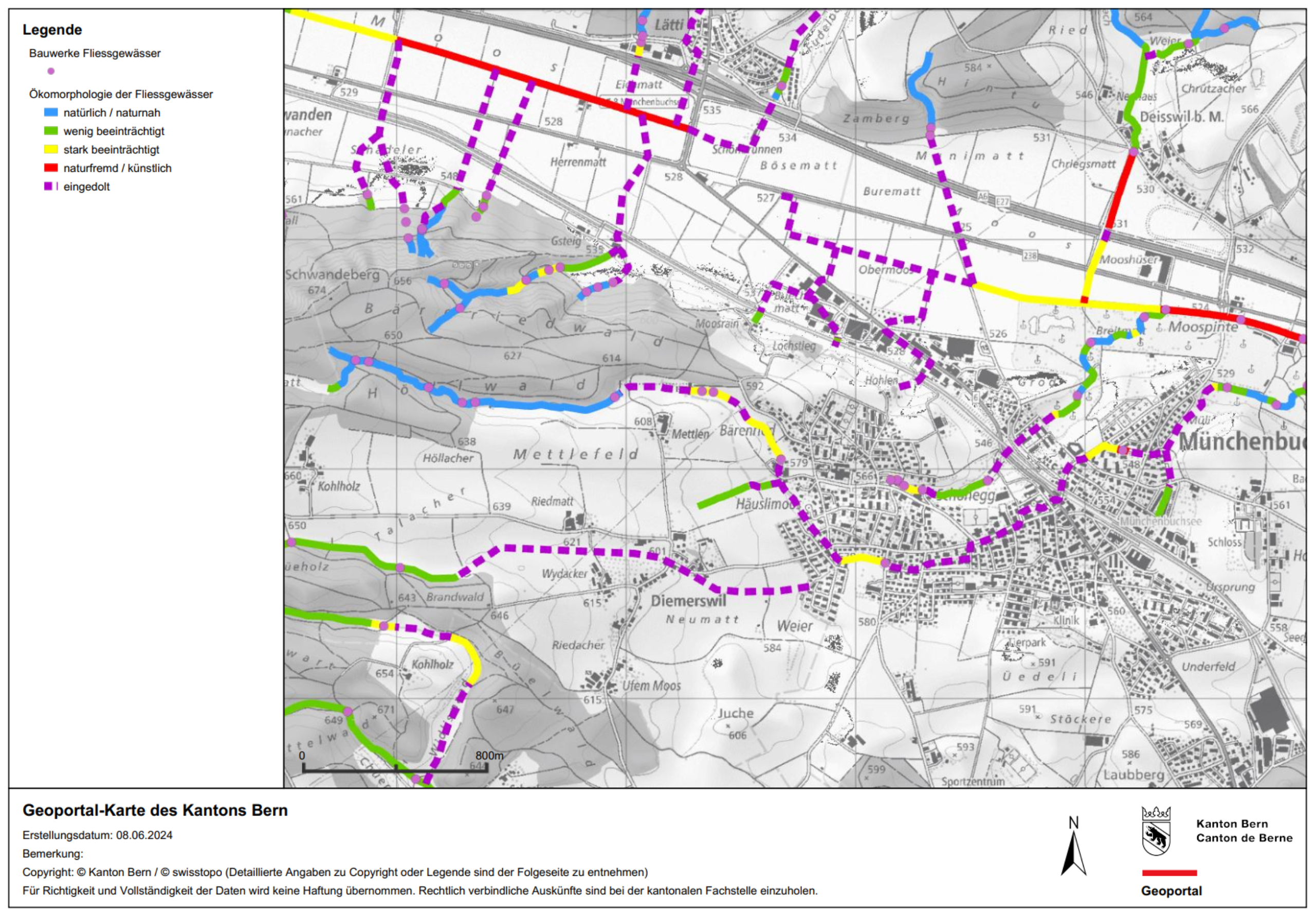 - um Jahrtausendwende: Offenlegung des Baches zwischen Siedlungsrand und Urtenenbach im Rahmen des Golfplatzbaus (ca. 800m). Nahe dem renaturierten Gewässer wurden zudem Stillgewässer (Teiche) angelegt. Im Unterlauf haben sich in den letzten 5-10 Jahren Biber niedergelassen.